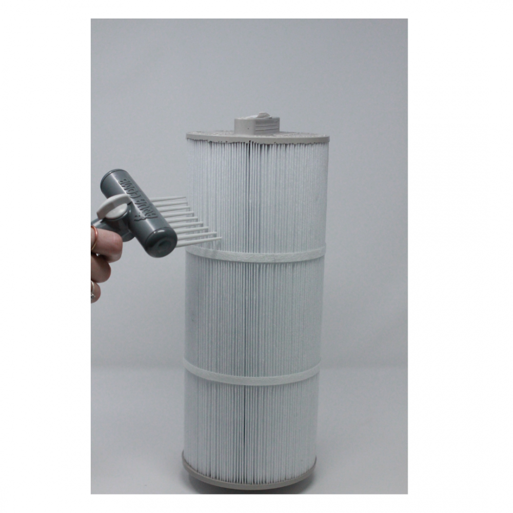 The Aqua Comb gets in between filters to remove stubborn stains. Cleaner filters mean cleaner water and trouble-free operation of your pool or spa. These pool and spa Aqua Combs are made in the U.S. and are handheld filter cleaning devices that attach to a standard garden hose. They offer a 3-inch water spray with a 9-finger pic comb to easily and thoroughly clean cartridge filters in 3-5 minutes. They even remove marsite, sand, bugs and other debris caught inside the filter pleats.